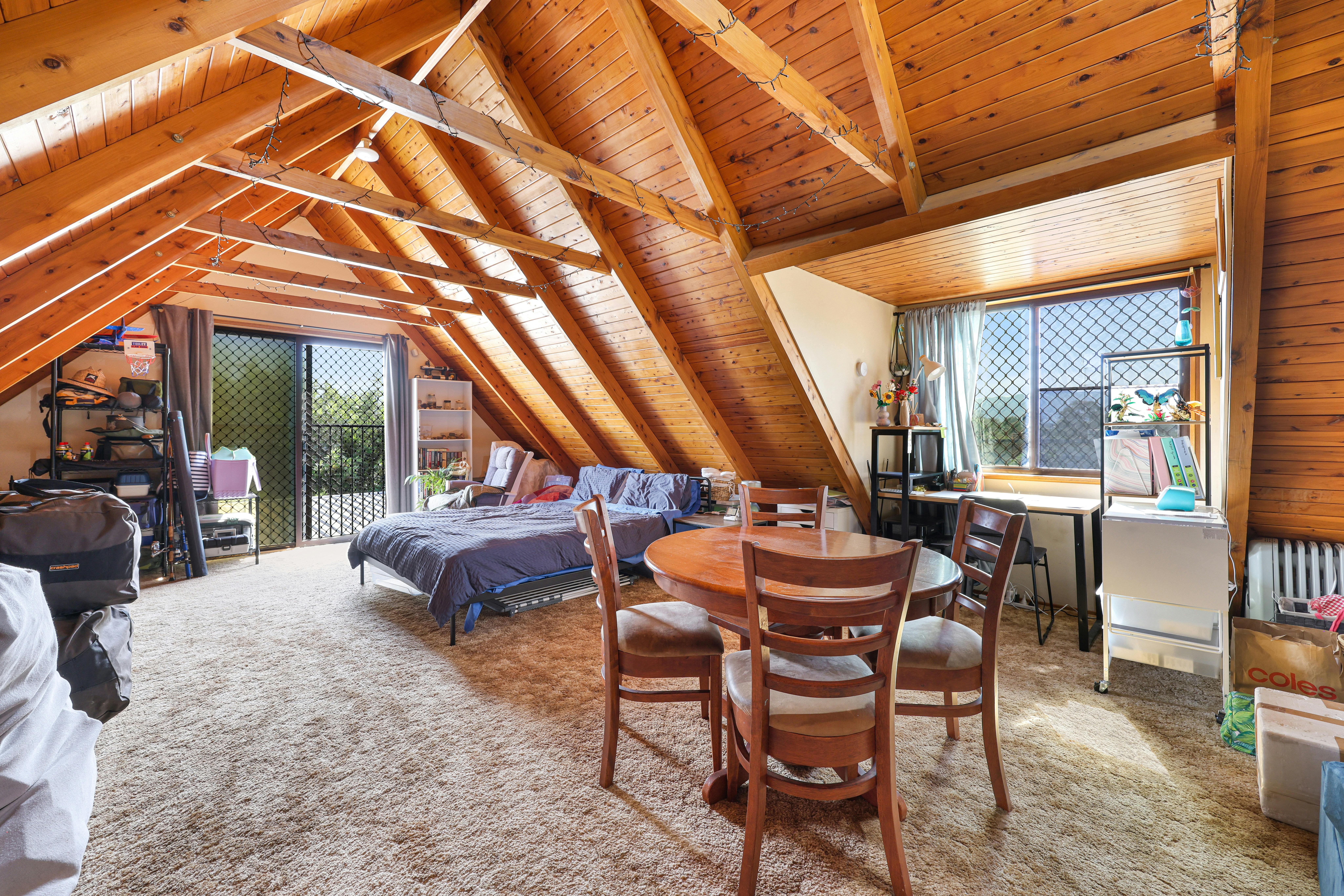 Upstairs, a spacious loft provides a real point of difference, serving as an ideal retreat for a third bedroom, home office, living space or creative studio. With its rustic timber panelling and plenty of natural light, it's a space that truly feels special.