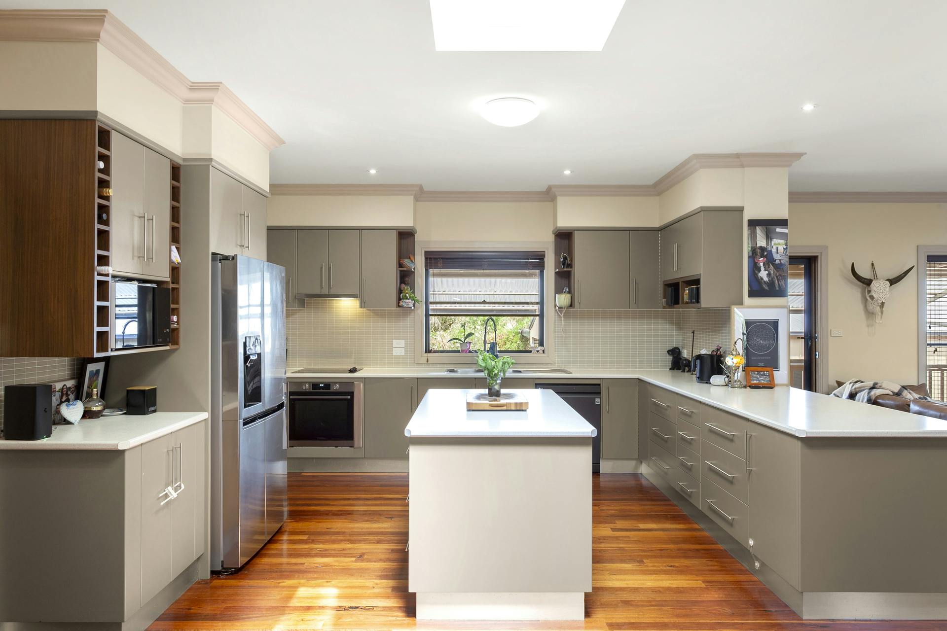 Positioned to overlook the open plan living and meals area, the kitchen stands as its own space while maintaining a visual connection.