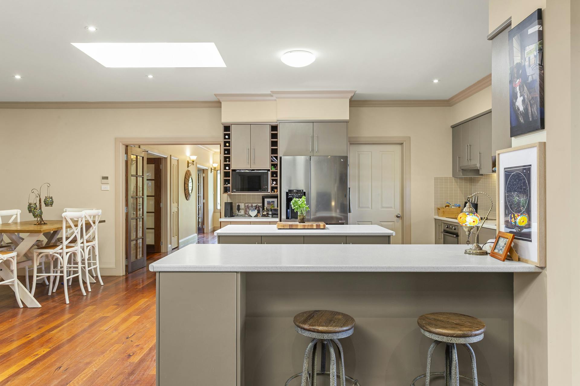 Sydney Blue Gum hardwood floors and French doors add warmth and classic charm, while quality finishes throughout reflect the careful attention to detail and craftsmanship that define this home.