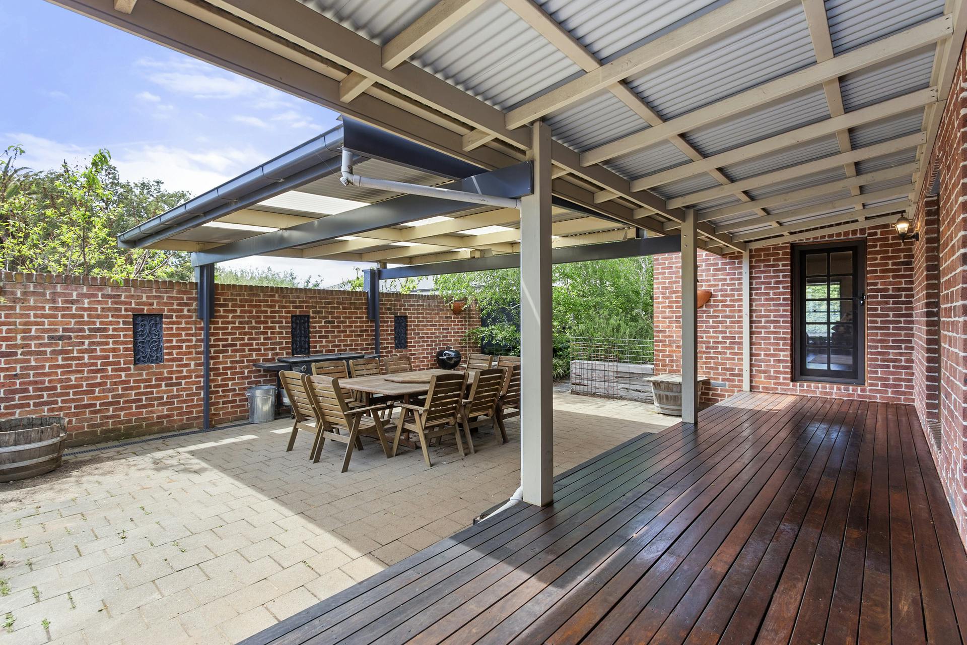 zones: a shaded alfresco courtyard on one side and a sunny deck on the other.