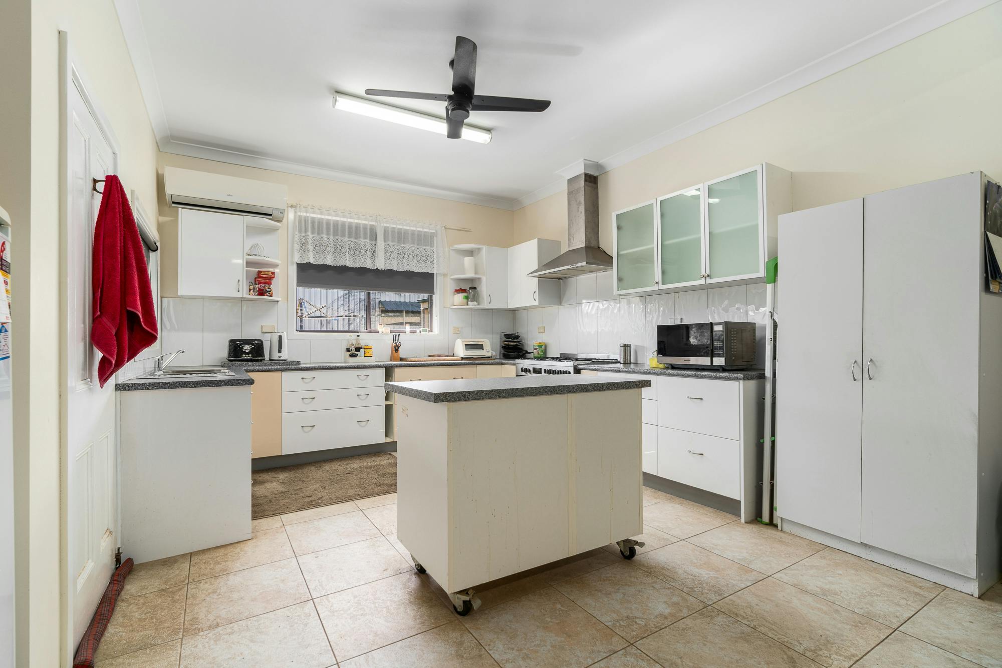 The kitchen is well appointed with a moveable island bench, gas cooktop and electric oven, offering both functionality and versatility. Comfort is assured year-round with gas heating, multiple split system air conditioners and ceiling fans throughout.