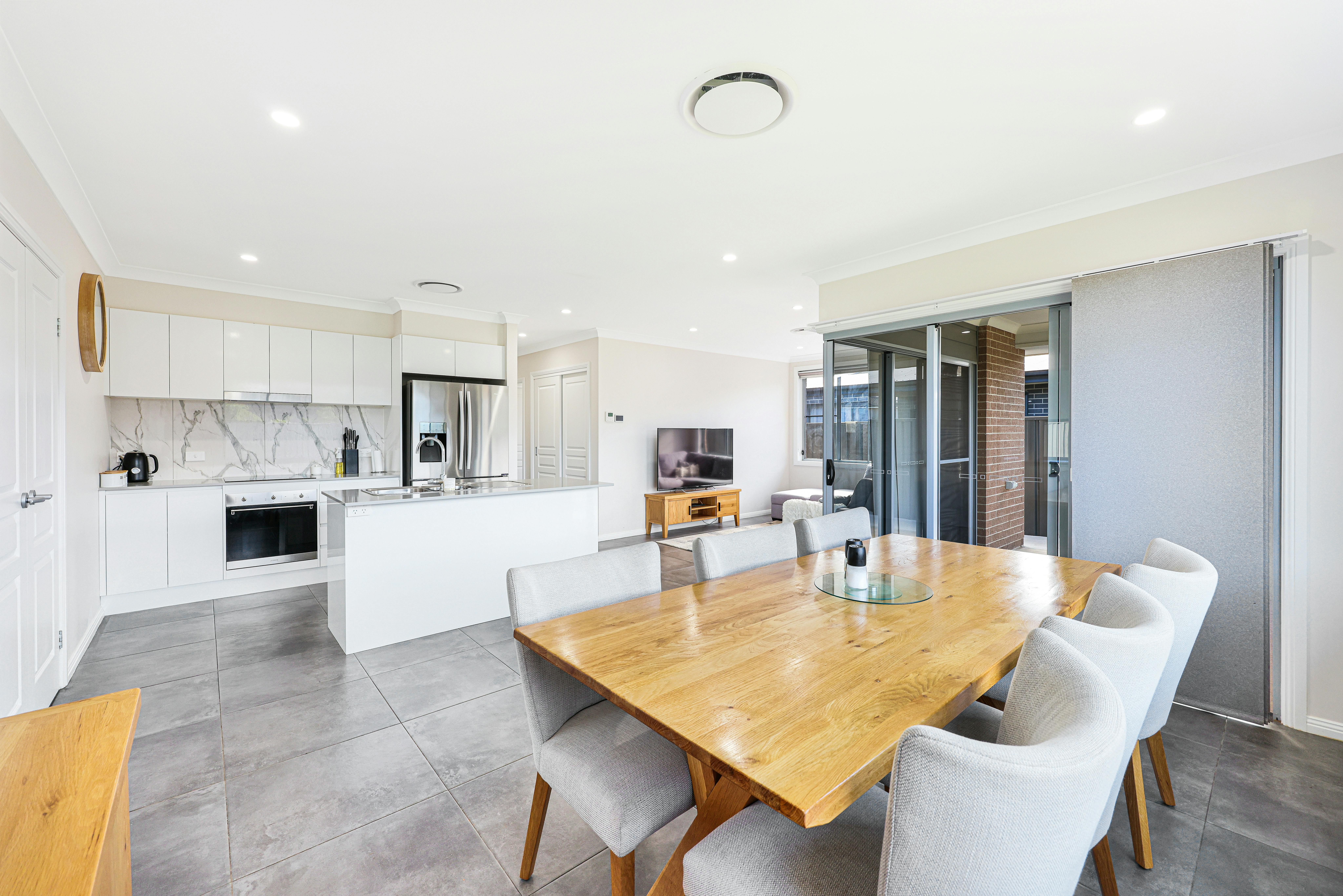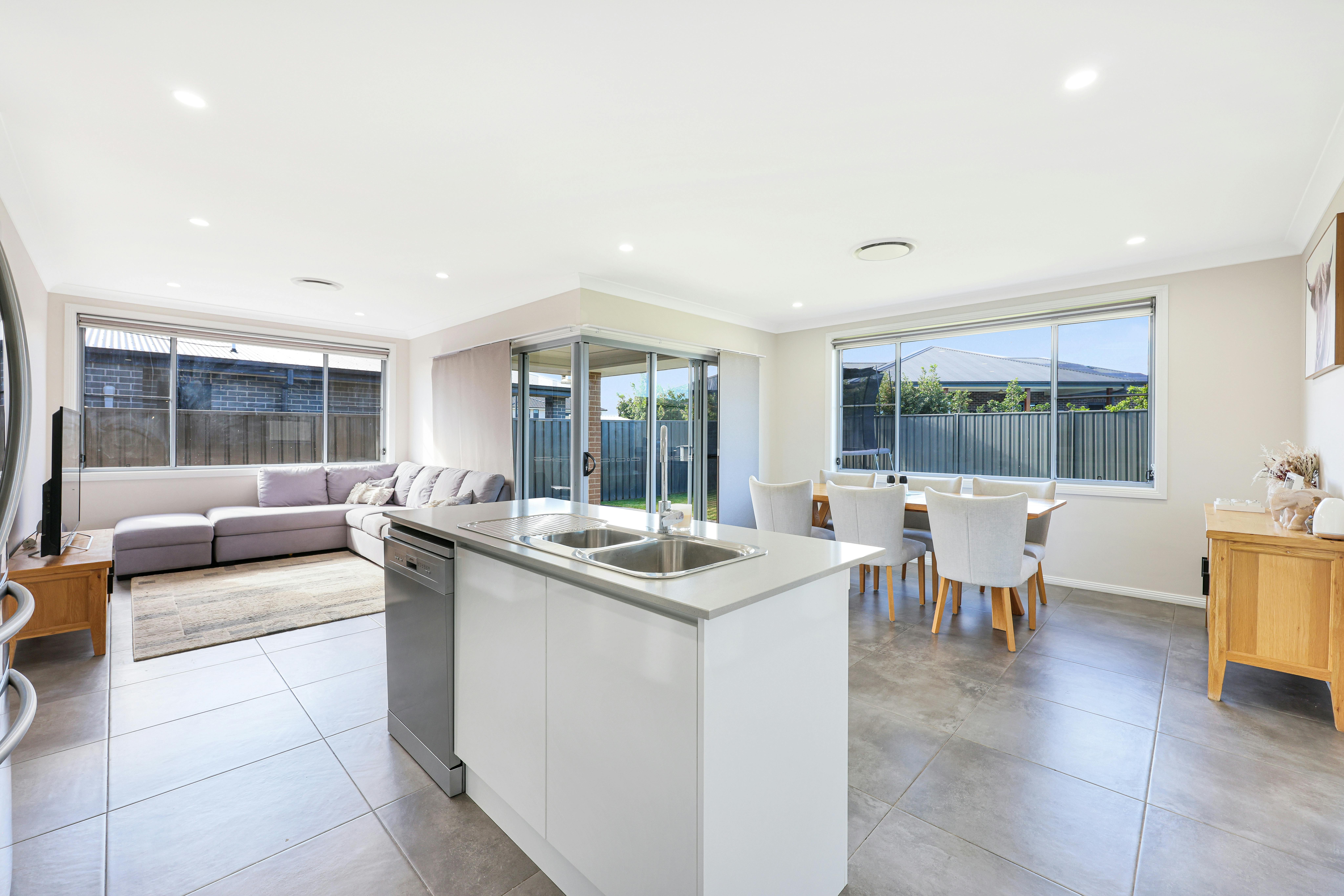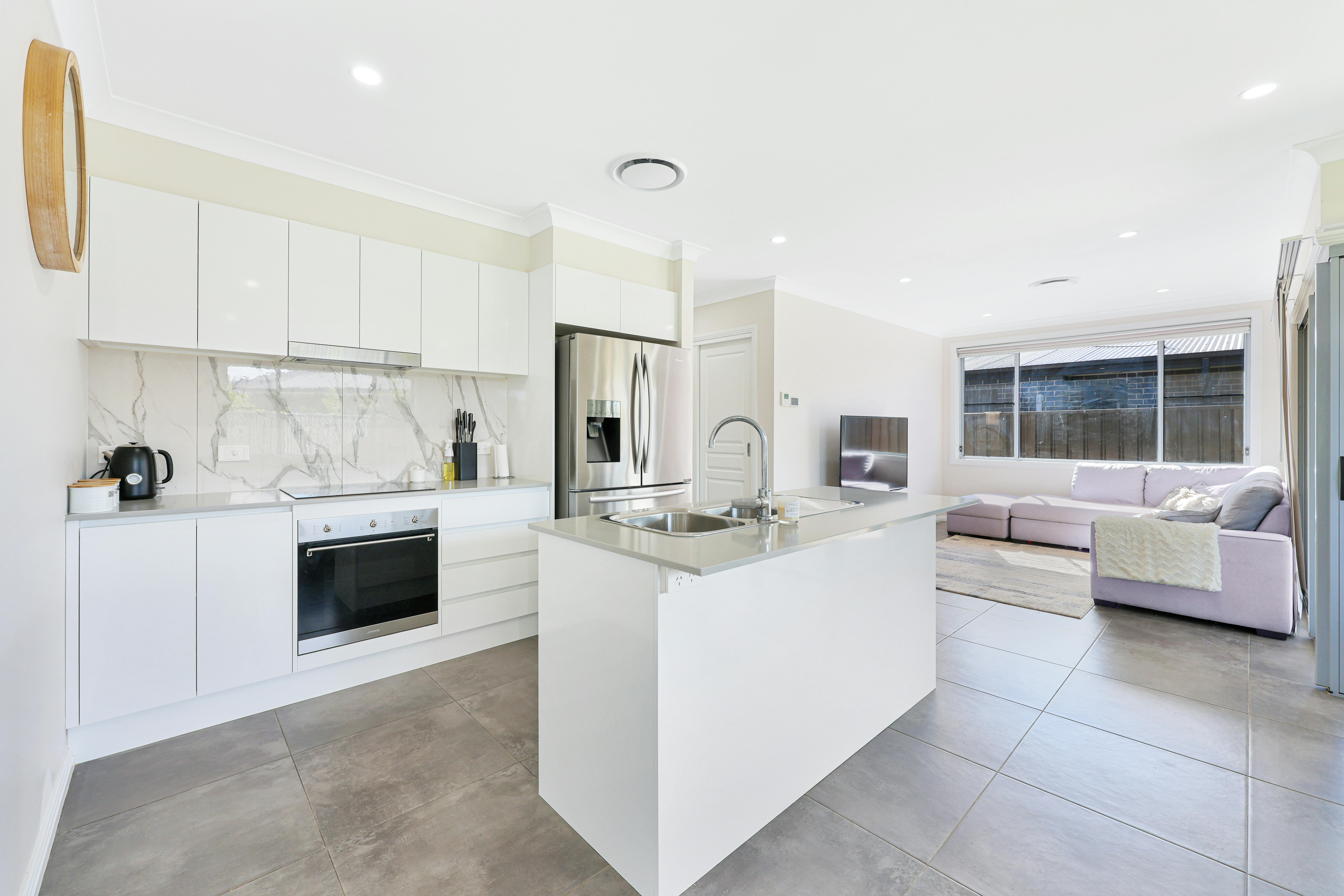 The heart of the home is the open-plan kitchen, dining and living area, designed for everyday comfort and easy entertaining. The kitchen features stone benchtops, a large island and excellent storage, overlooking the main living space and flowing seamlessly to the covered alfresco and backyard.