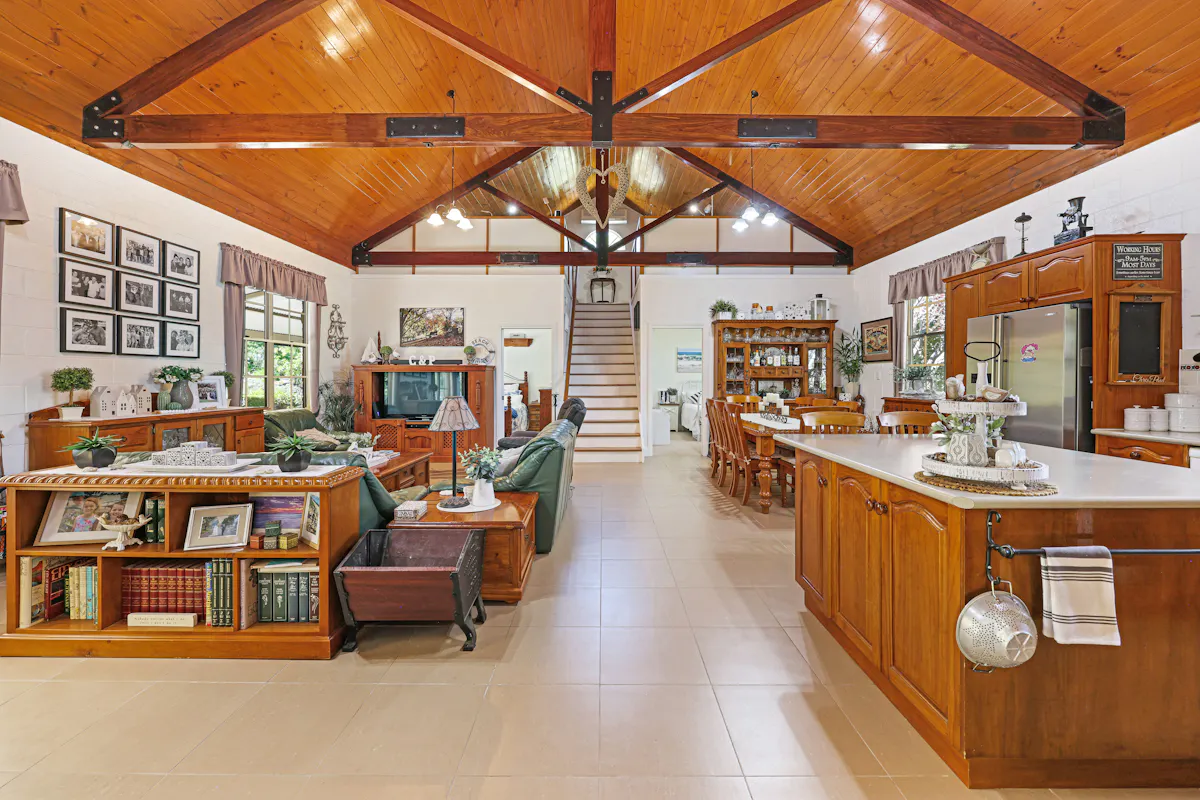 • Expansive living with raked timber ceilings, air conditioning, and wood fire